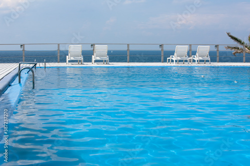 © Paylessimages, Obraz premium プールサイドに置かれたサマーベッド