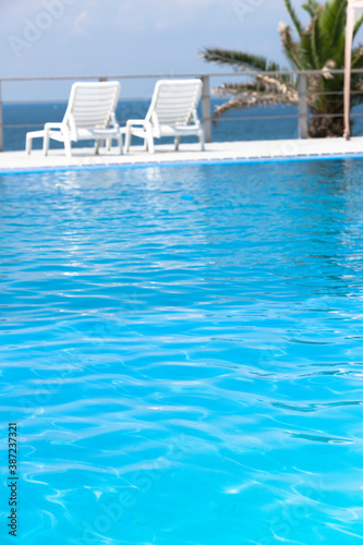 © Paylessimages, Obraz premium プールサイドに置かれたサマーベッド