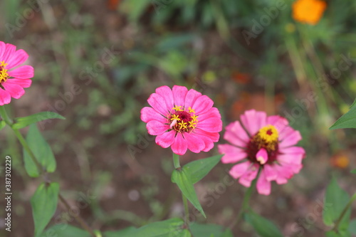 Obraz premium 秋の花壇に咲くヒャクニチソウのピンクの花