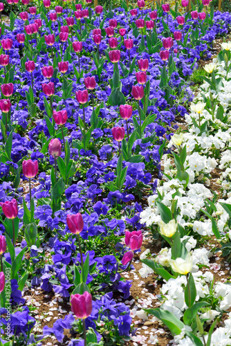 © Paylessimages, Naklejka premium チューリップとパンジーと桜の花びら