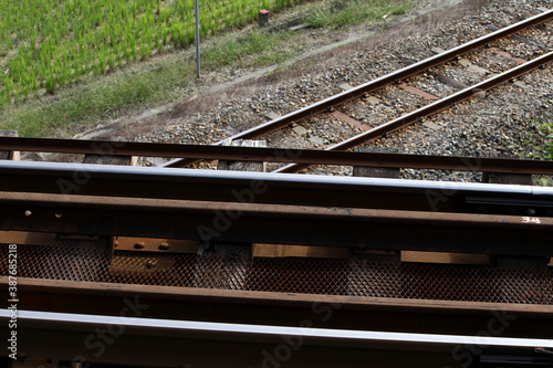 © motchy, Fototapeta premium 上下に交差する電車のレール