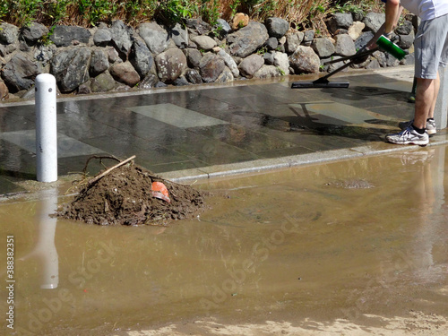 © Paylessimages, Naklejka premium 京都嵐山桂川の洪水で道路の泥を取り除く