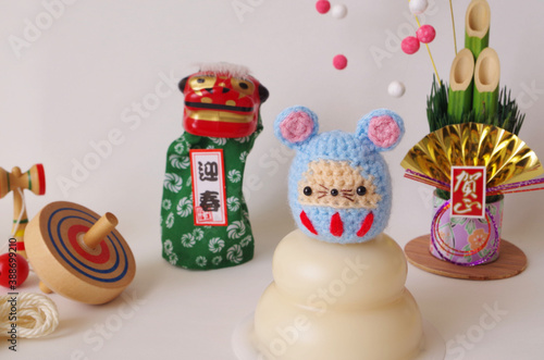 Obraz premium ねずみのあみぐるみとお正月イメージ