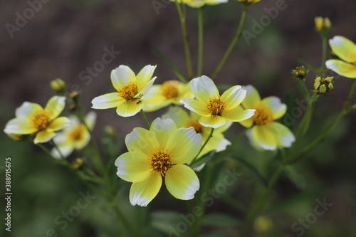 Obraz premium 秋の公園に咲くウインターコスモスの黄色と白のグラデションの花