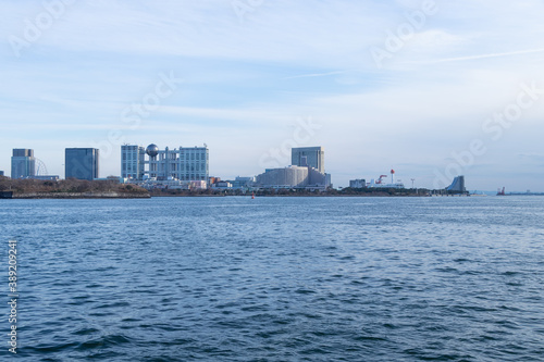 Naklejka premium 青空を背景に芝浦ふ頭から見たお台場のビル群