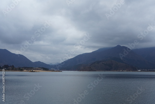 Fototapeta premium 曇り空の河口湖と周辺の山々の風景