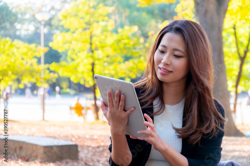 Fototapeta premium 【東京都】屋外でタブレットを操作する女性【2020年 紅葉】