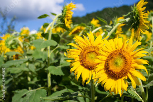 Obraz premium ひまわり畑 向日葵 夏 イメージ 9月 ミツバチ 岐阜県美濃市 洲原ひまわりの里