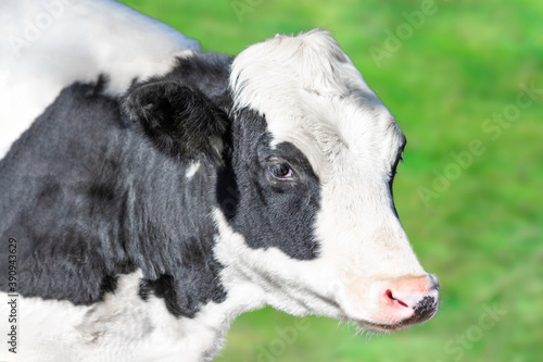© chikala, Obraz premium 緑の牧場を背景にした牛の横姿の斜め上からの顔アップ