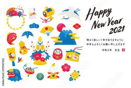 Obraz premium 2021 丑年 年賀状 縁起物デザイン カラフル水彩風