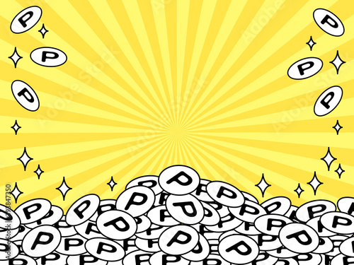 Fototapeta premium 積み重なり輝くのポイントコインのフレーム 中央からの集中線 複数バリエーションあり
