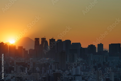 Naklejka premium 夕陽が沈むオレンジの空を背景にシルエットになって見える富士山と新宿のビル群