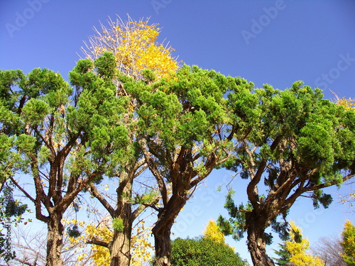 Obraz premium 公園の黄葉の銀杏の木と剪定されたコニファーと青空