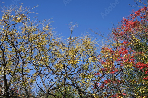 Obraz premium 冬の栴檀の木と紅葉のハゼノキと青空