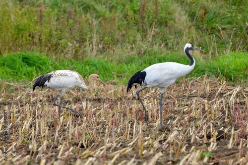 Obraz premium 親鳥の後をついて餌を探すタンチョウヅルの幼鳥@北海道
