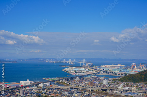 Obraz premium 瀬戸大橋と四国側の街並み(香川県坂出市、綾歌郡宇多津町)