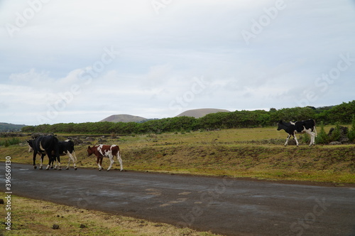 Obraz premium 道を歩いて移動する牛 /イースター島