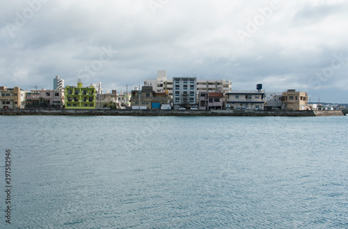 Naklejka premium 低層のビルが並ぶ対岸の街並み