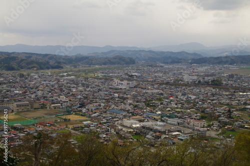 Obraz premium 丘の上から小さな田舎町を見下ろす