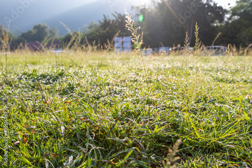 Obraz premium キャンプ場の草に朝露