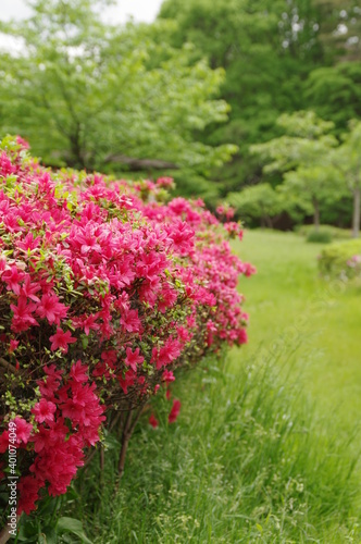 © Enriqecido, Naklejka premium 節度・慎みの花言葉のつつじ、ピンクと花弁と緑の葉の生垣