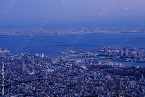 Obraz premium 兵庫県神戸摩耶山掬星台から見た市街地。やがて陽が落ちようとしている少し前の時間マジックアワーである。もうすぐ百万ドルの夜景が見られる