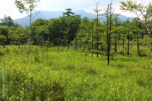 Fototapeta premium 夏の高原。奥日光戦場ヶ原。戦場ヶ原は奥日光に広がる湿原。中禅寺湖をめぐって男体山(二荒山)と赤城山の神様がそれぞれ大蛇と大ムカデに化身し戦った場所と伝わる。