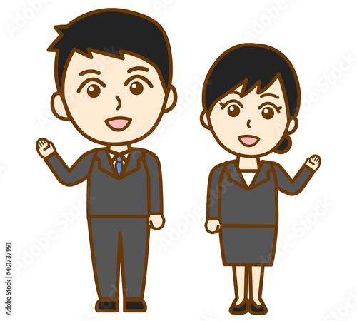 © murasaki, Fototapeta premium 片手を上げて案内誘導するリクルートスーツ姿の男女の全身イラスト