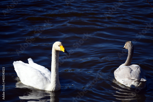Obraz premium オオハクチョウの成鳥と幼鳥。2020年12月。日本。千葉県