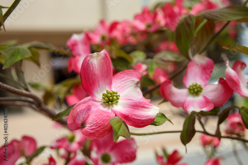 Obraz premium 街中のピンク色のヤマボウシの花の木