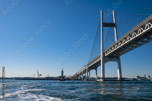 Naklejka premium 日本の横浜にあるベイブリッジ。海から見た青い空と橋の風景。