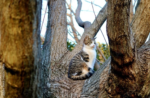 Obraz premium 木の上 横向きなねこ 冬の公園