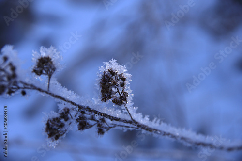 Obraz premium びっしりと霜の付いた冬の木の枝。極寒の朝の自然。