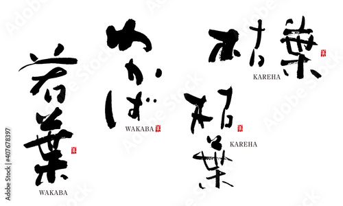© akira-o, Fototapeta premium 若葉 わかば 枯葉 筆文字 デザイン書道 花の名前シリーズ