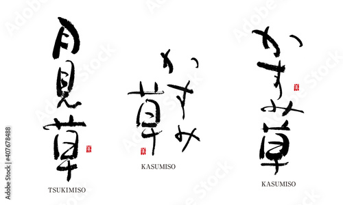 Naklejka premium 月見草 つきみそう かすみ草 筆文字 デザイン書道 花の名前シリーズ