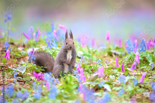 © Shan W, Fototapeta premium エゾリス 北海道樺戸郡浦臼町 浦臼神社 カタクリ エゾエンゴサク