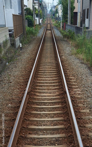 © tagu, Naklejka premium 街の中を通るまっすぐな線路。鉄道のレール。