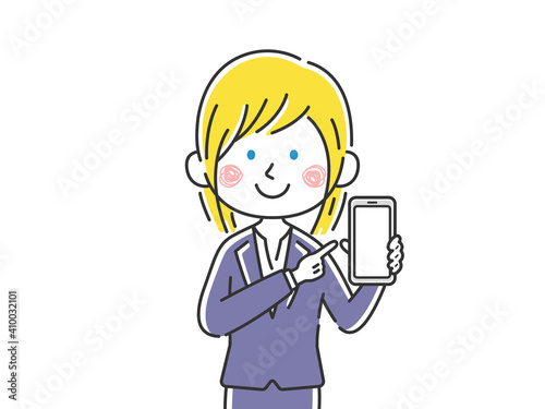 Obraz premium スマートフォンの画面を見せる白人ビジネスウーマンのイラスト