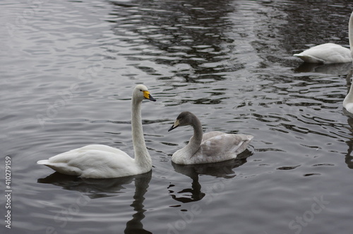Fototapeta premium 厳しい寒さを避けて越冬で飛来地へと渡ってきた、美しい白い羽毛のオオハクチョウ