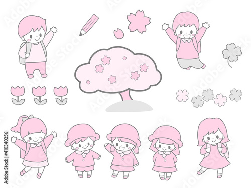 © arurizu, Obraz premium 幼稚園生と小学生のかわいい子ども達の入園入学など桜の春の手描き風ピンクイラストセット