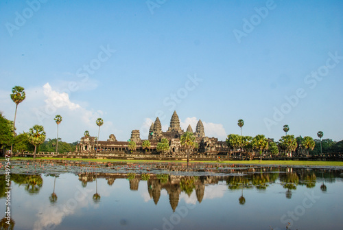 Obraz premium 昼間のアンコールワットと、池に写ったアンコールワット、リフレクション