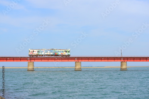 © HIDEKAZU, Fototapeta premium 赤い鉄を橋の上を走るカラフルな車両