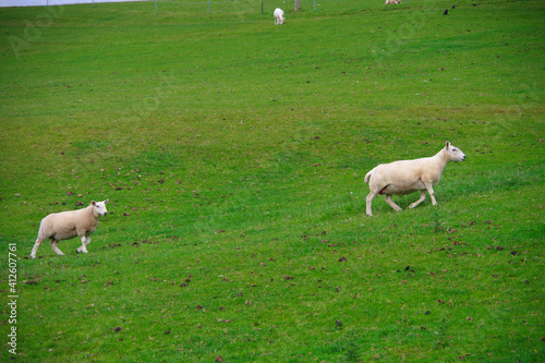 Fototapeta premium 牧場を歩く 羊達 羊の親子