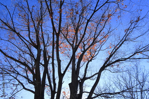 Obraz premium 黄葉の枯れ葉をつけた冬の公園の欅と青空