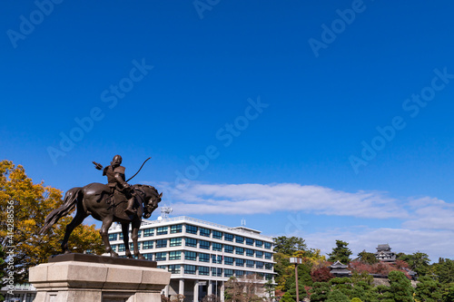 © area1964, Naklejka premium 松平直政公騎馬像と松江城 島根県松江市