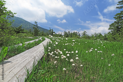 Fototapeta premium 新緑の尾瀬 木道の周りにはたくさんのワタスゲが咲く