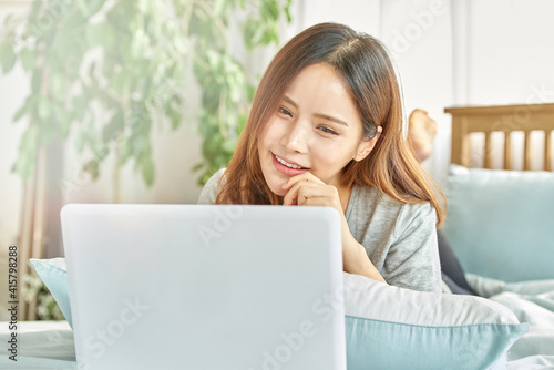 Naklejka premium 동양인 한국인 아름다운 여성 모델 침대위에서 노트북을 보며 휴식, 쇼핑, 화상채팅