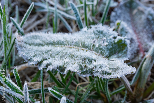 Fototapeta premium 緑の葉に降りた霜のクローズアップ