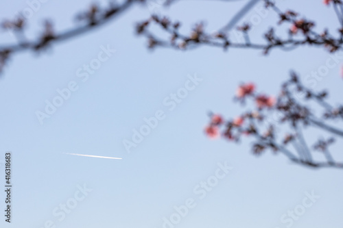 Obraz premium 河津桜と飛行機雲 千葉県市川市 日本