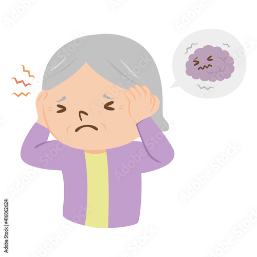 © yukimco, Obraz premium 病気の高齢者のイラスト。頭が痛い女性のお年寄り。